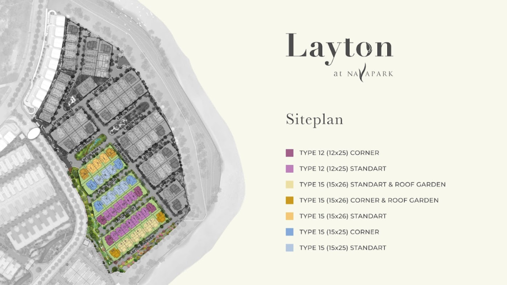 Akan ada 2 tipe di Cluster Layton Navapark berdasarkan ukuran lebar bangunannya. Layton navapark tipe 12 dan layton navapark tipe 15. Khusus untuk tipe 12 ada beberapa tipe corner menghadap sungai dengan 4 rooftop mewah.